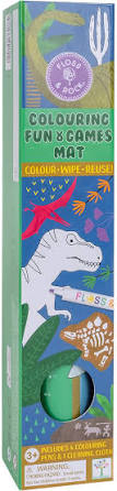 COLOUR. WIPE. REUSE. Our brand new Colouring Fun, Games Mat is a brilliant multi-play activity for travel. Simply roll out the mat for colouring, dot-to-dot, a maze and tic tac toe’ games. When finished, wipe clean, roll up and use the fastening band to pack the mat away in the handy box to use over and over again! Our ROAR-some Dino design features all of your favourite Floss & Rock dinosaur illustrations. The mat includes 4 colour dry wipe pens, a handy cleaning cloth, fastener band and a reusable storage box. FEATURES: Brilliant for on-the-go 4 wipe clean activities on one handy mat Reusable over and over again Includes 4 colour dry wipe pens and a cleaning cloth Recommended age: 3+ ECO-FRIENDLY BENEFITS: Printed with soy inks Made from recycled materials Box and silicone mat fully recyclable